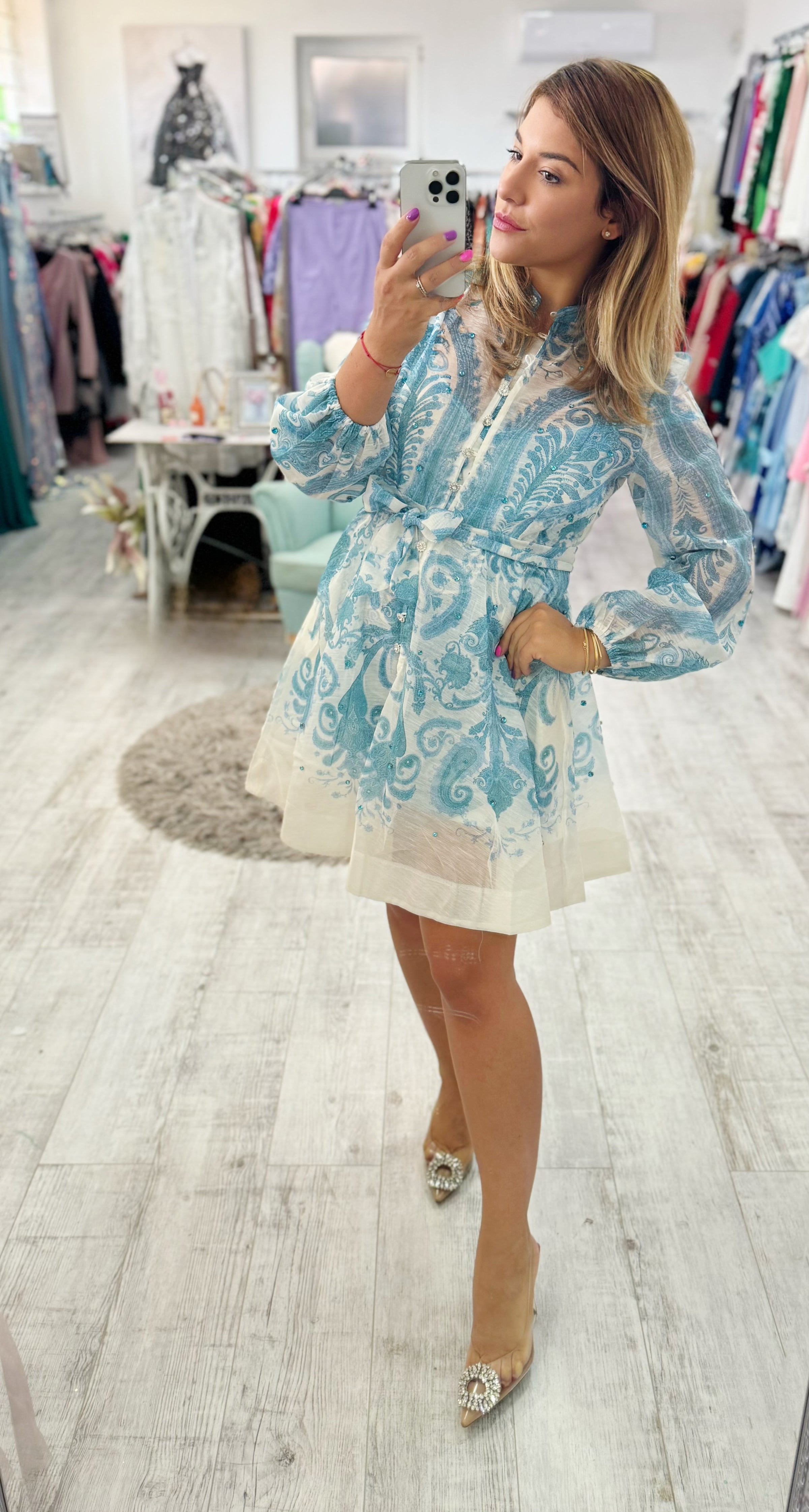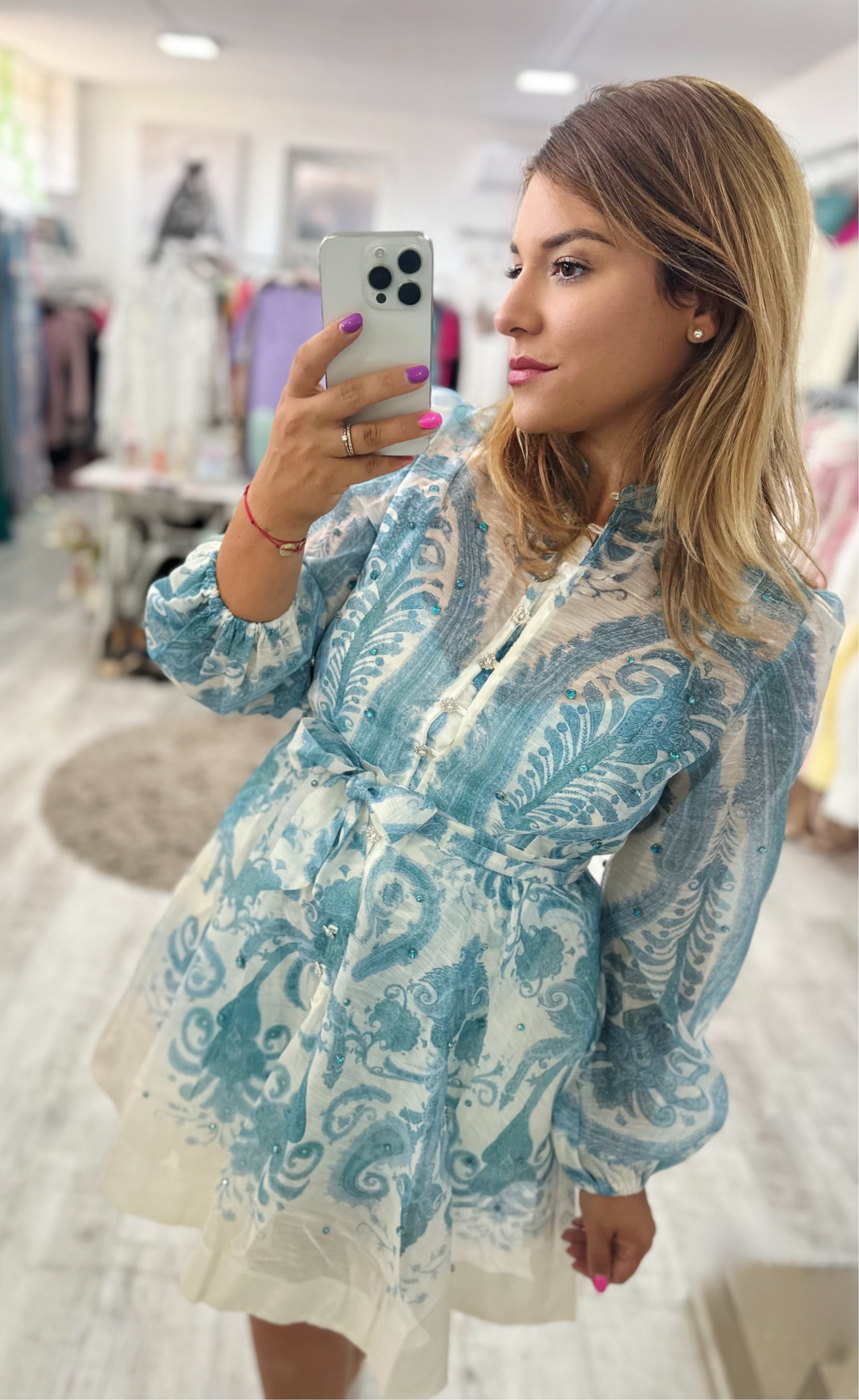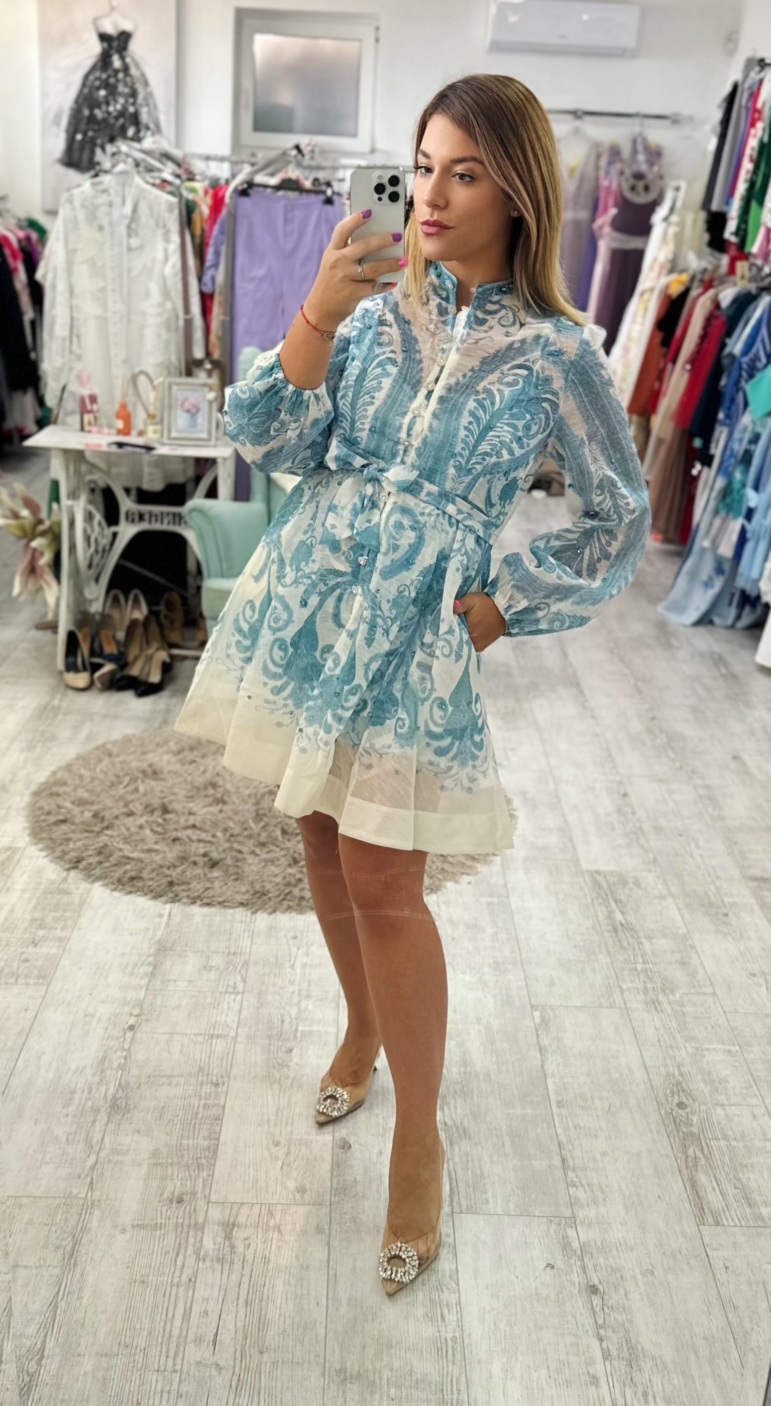 Csodás élénk motívumokban gazdag Blue ruhánk mindenki kedvence lesz! Vidám színek és káprázatos mintázat jellemzi, tökéletes választás a hétköznapokra és esküvőre is egyaránt.